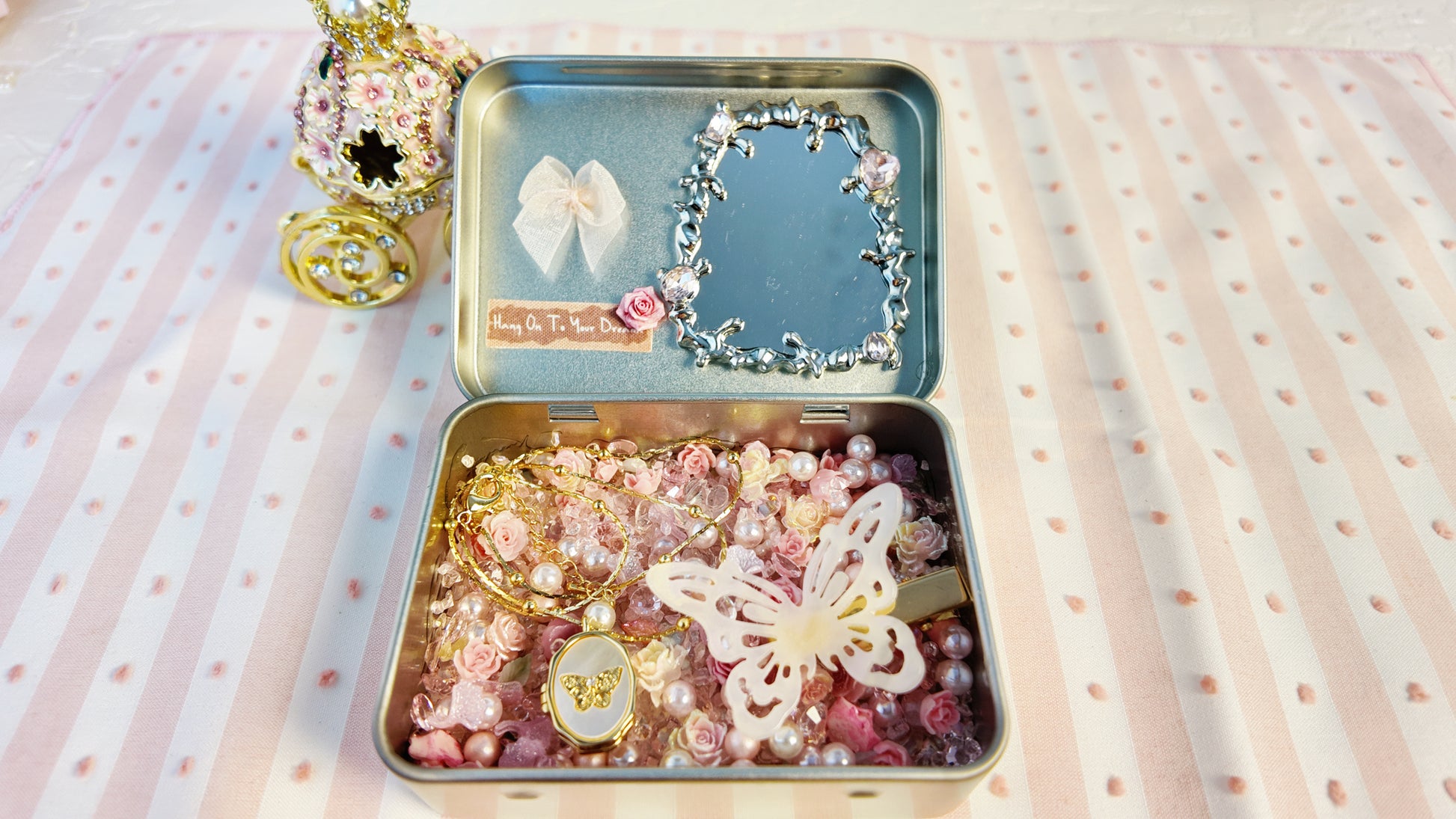 Roses, pearls, and butterflies create a soft, coquette vibe. Opening the tin feels like unveiling a tiny pink garden—perfect for gifting and photos.